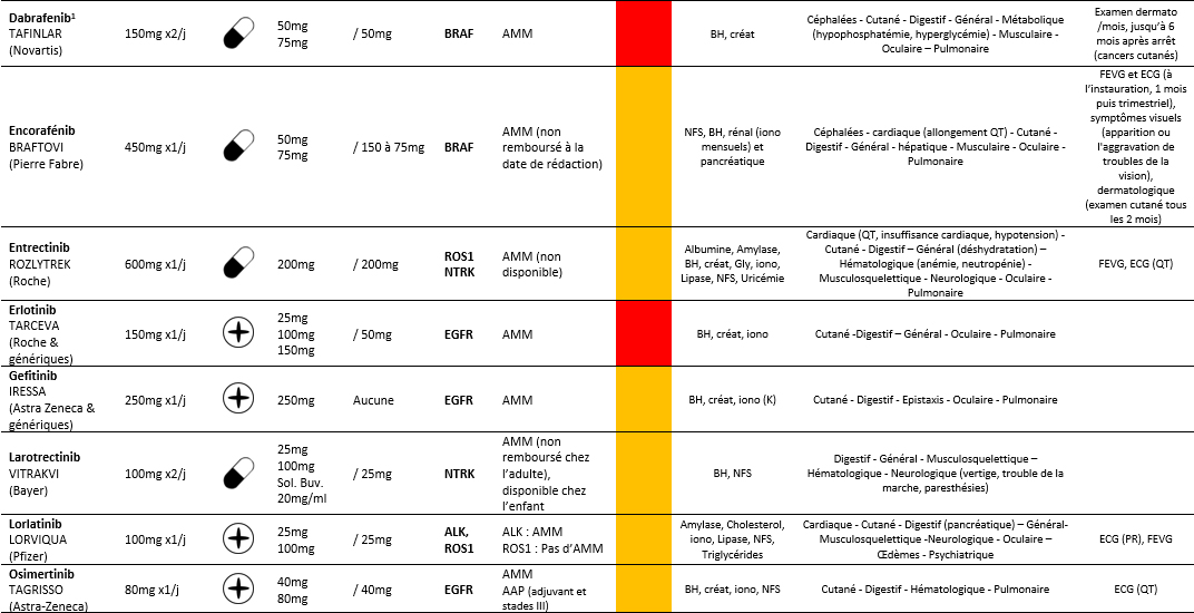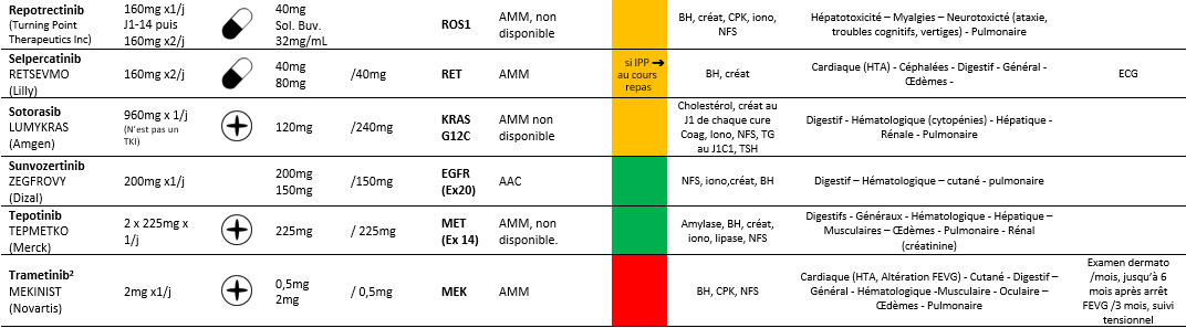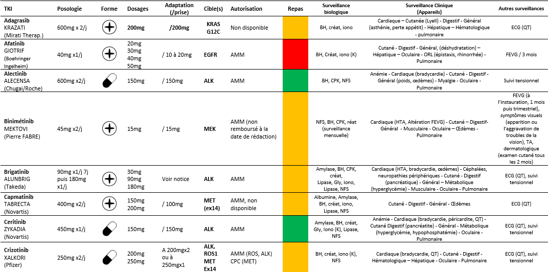 Modalités thérapeutiquesInhibiteurs des Tyrosines Kinases utilisés dans les CBNPC Principales modalités d’utilisation des ITK indiqués dans les CBNPC. Voir le référentiel