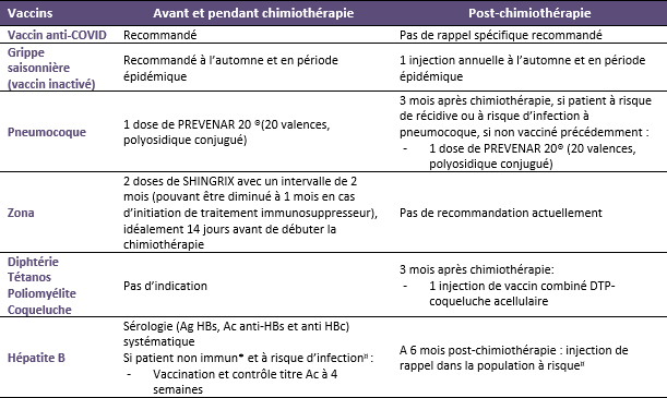 - Les vaccins recommandés doivent être effectués au plus tôt avant le traitement anticancéreux bien qu’il soit possible de vacciner jusqu’au 1er jour de la chimiothérapie.