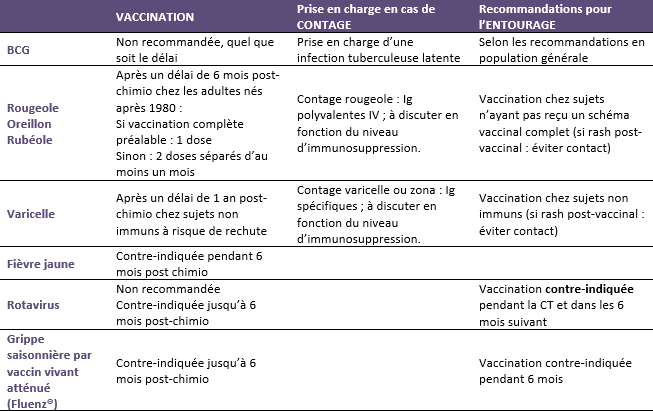 - Les vaccins vivants sont contre-indiqués au cours de la chimiothérapie ou de l’immunothérapie et dans les 6 mois suivant l’arrêt.