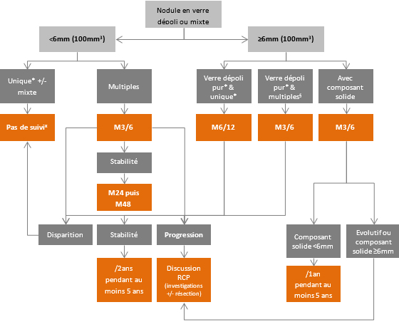 Les nodules en verre dépolis et mixtes nécessitent un suivi prolongé lorsqu’ils sont stables en taille et densité. Un suivi d’au moins 5 ans parait souhaitable, particulièrement en cas d’âge > 65ans, d’ATCD de cancer, de taille initiale ≥8mm, de présence d’un composant solide ou d’un bronchogramme aérien (35).
